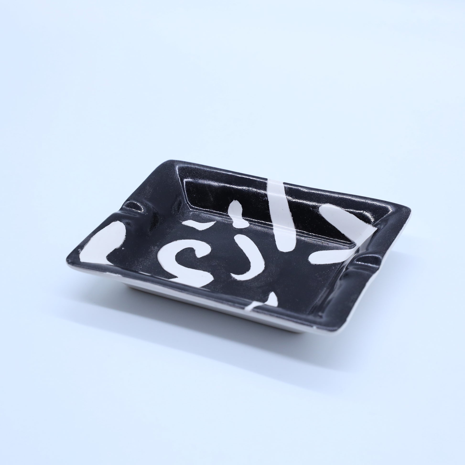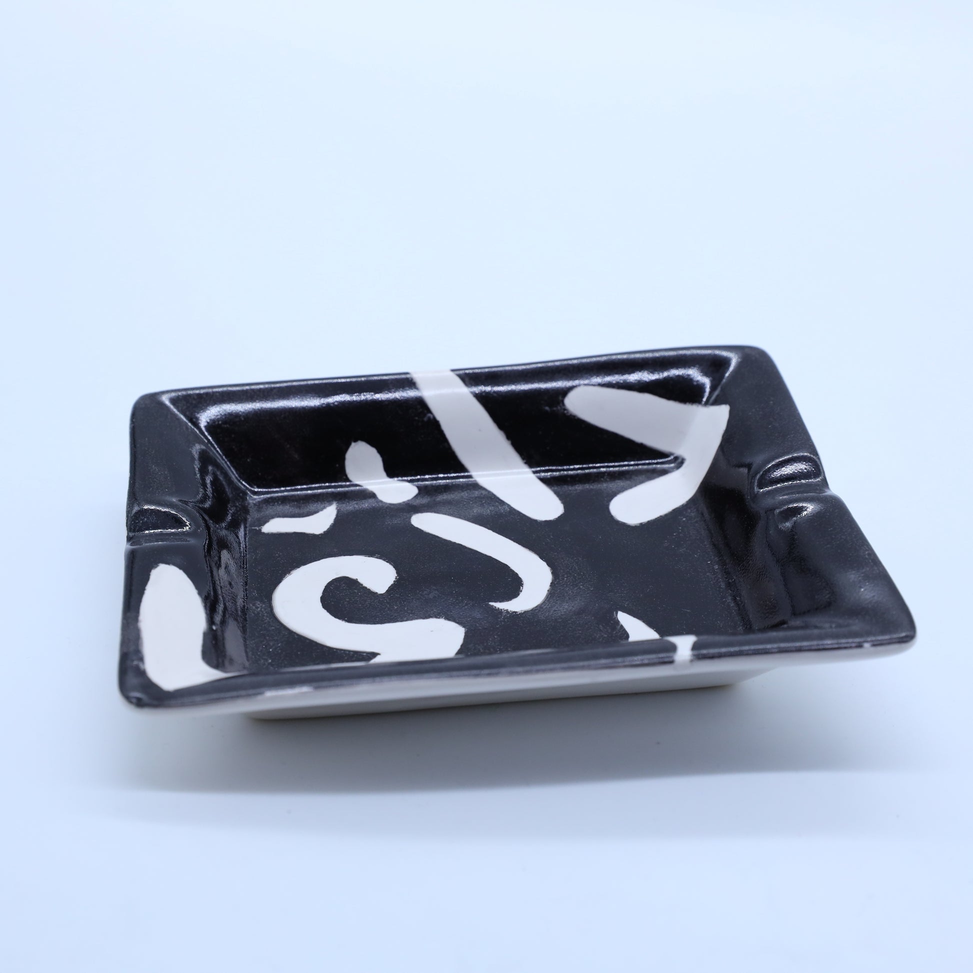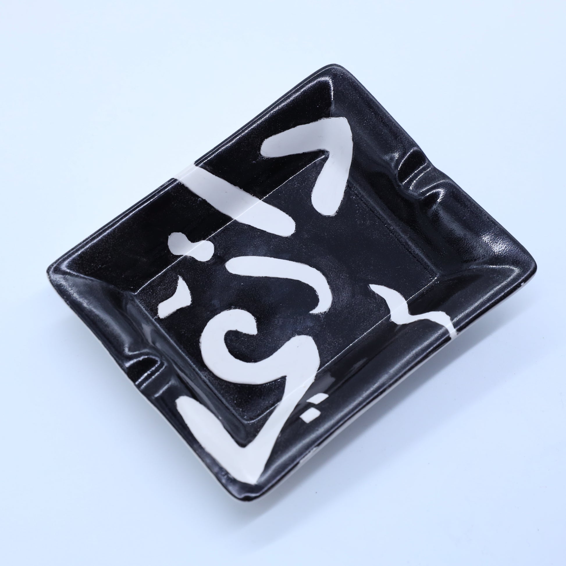 Introducing our exquisite Mystic Black Smoke ashtrays, a perfect blend of sophistication and unique design. Crafted by a talented Lebanese artist, these ceramic ashtrays showcase meticulous attention to detail with sleek black finishes adorned with white Arabic writing or striped black and white patterns.