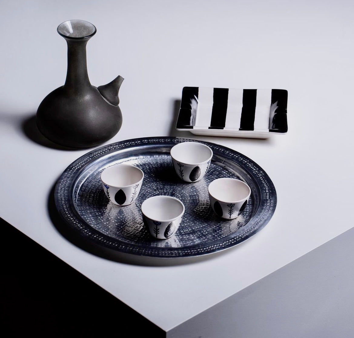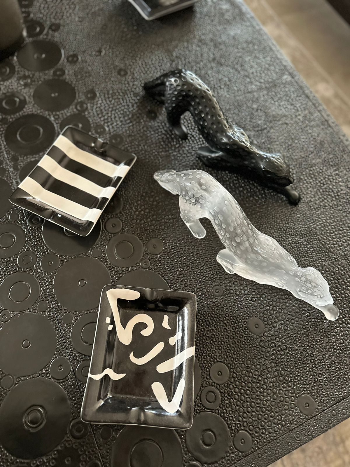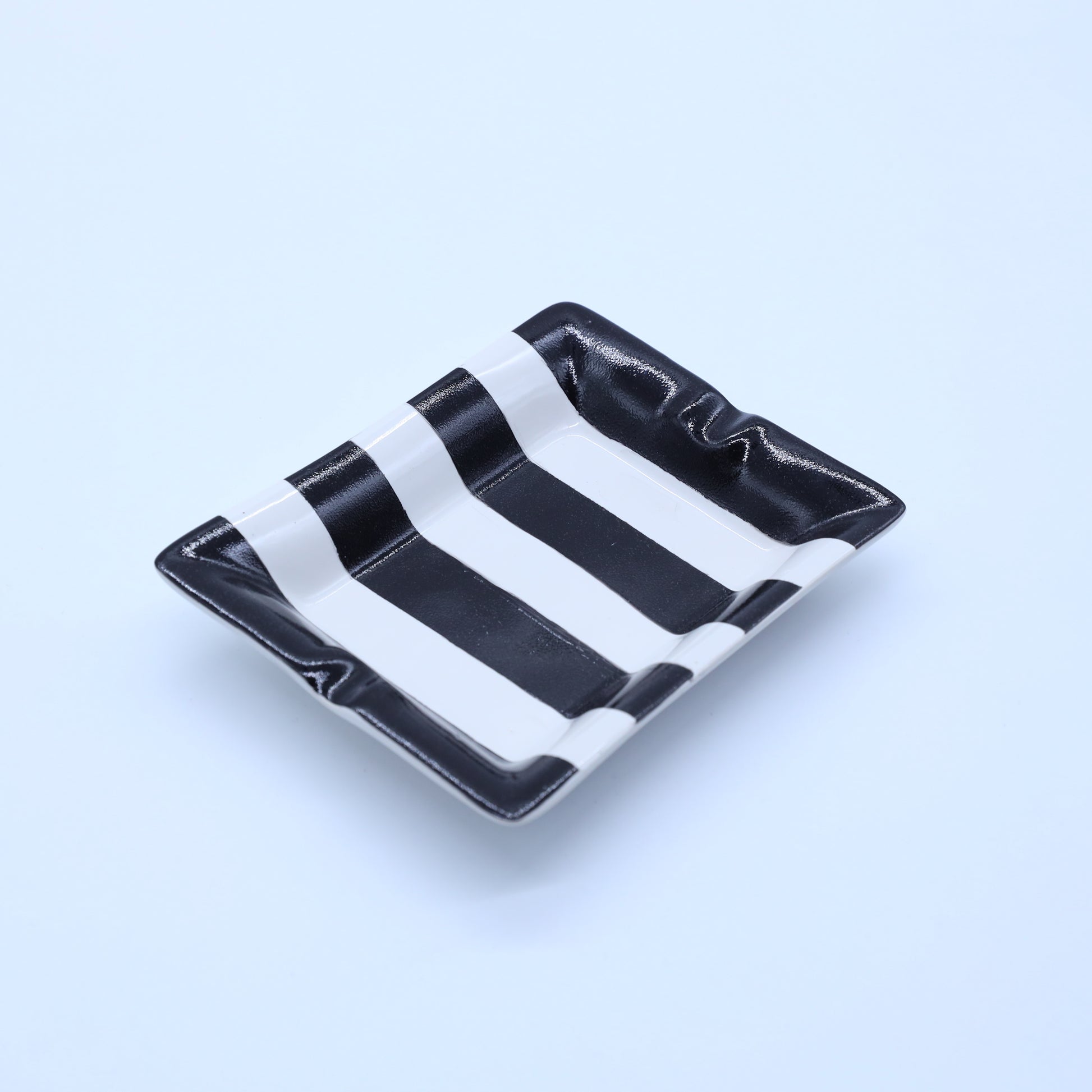 Introducing our exquisite Mystic Black Smoke ashtrays, a perfect blend of sophistication and unique design. Crafted by a talented Lebanese artist, these ceramic ashtrays showcase meticulous attention to detail with sleek black finishes adorned with white Arabic writing or striped black and white patterns.